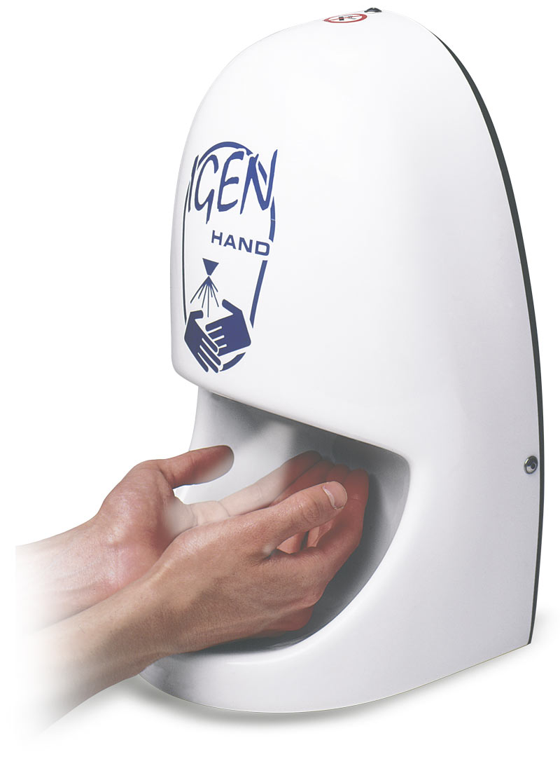 IGENHAND assicura una perfetta disinfezione delle mani. È sufficiente avvicinare le mani all’apposito vano ed un “occhio elettronico” rileva la presenza e attiva il processo di nebulizzazione della soluzione disinfettante